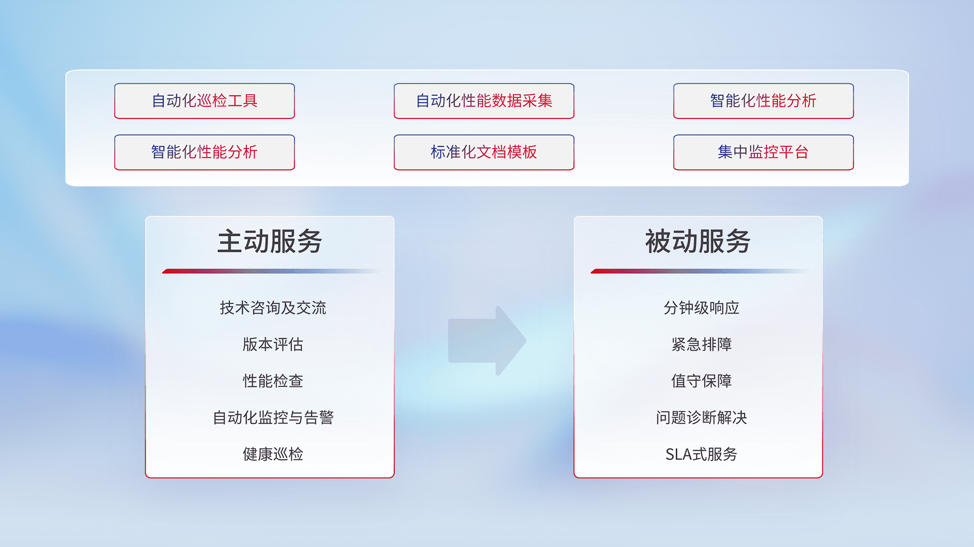 智能化工具和标准化文档,,,,保障服务质量,,提供主动服务(包含技术咨询、、、版本评估、、、性能检查、、自动化监控与告警、、、健康巡检)和被动服务包含(分钟级响应、、紧急排障、、值守保障、、、问题诊断解决、、SLA服务)。。。